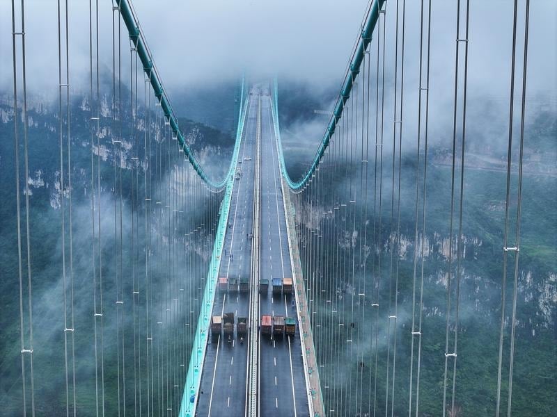 Guizhou eyalet yetkililerine göre, ana açıklığı bin 420 metre olan köprü, dağlık arazide inşa edilen dünyanın en uzun açıklıklı çelik kafes kirişli asma köprüsü oldu.