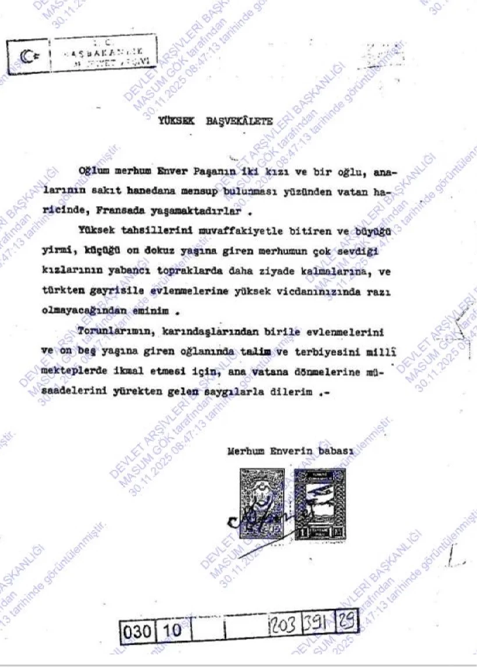 Devlet Arşivleri’nden çıkan mektup, Enver Paşa’nın babası Hacı Ahmet Paşa’nın 1937’de İsmet İnönü’ye sürgündeki torunlarının Türkiye’ye dönmesi, eğitimlerini tamamlaması ve Türklerle evlenmeleri için izin talep ettiğini ortaya çıkardı. Talep, 1939’da çıkarılan kanunla karşılık buldu.