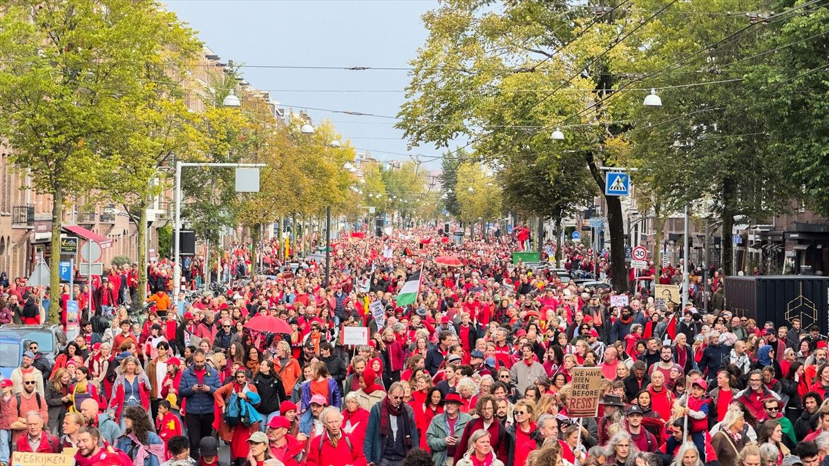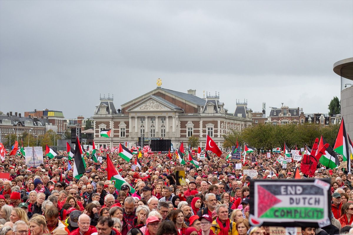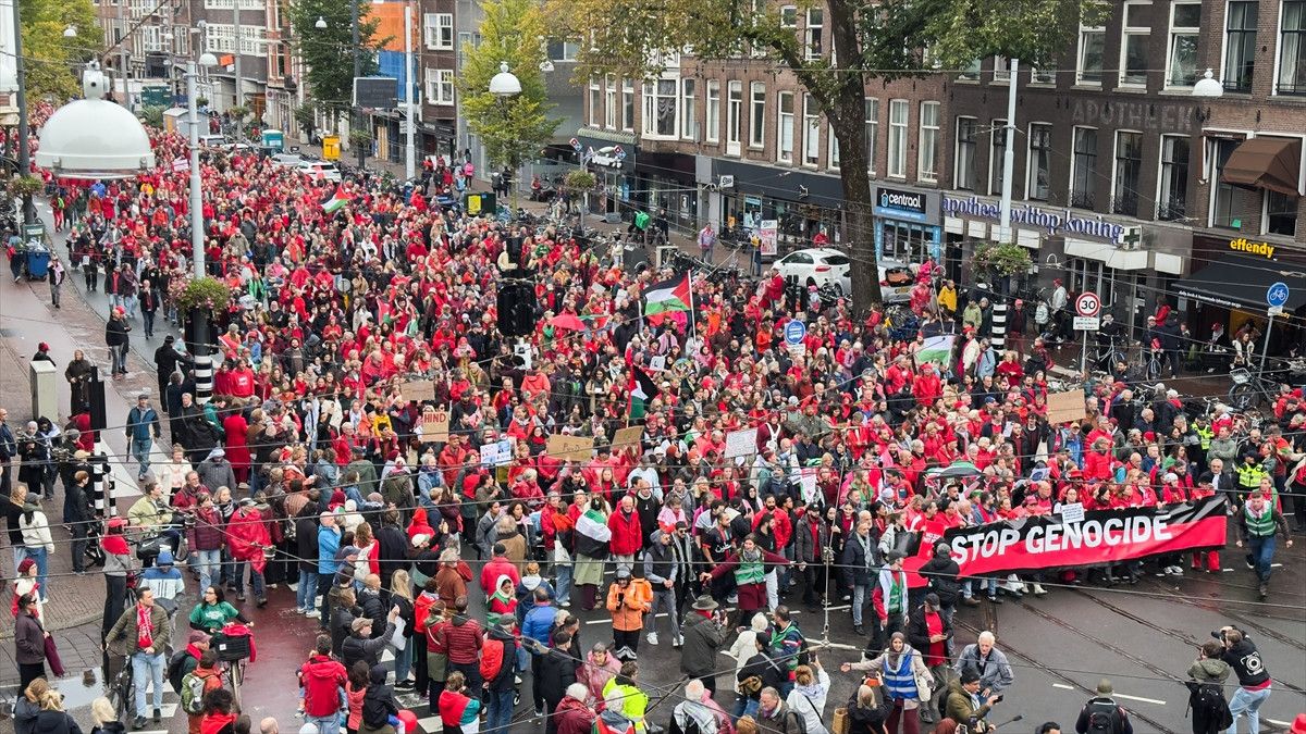 Amsterdam’da toplanan yaklaşık 250 bin kişi, hükümetin İsrail yanlısı politikasını protesto ederken gösteride çok sayıda uluslararası ve yerel sivil toplum kuruluşu yer aldı.
