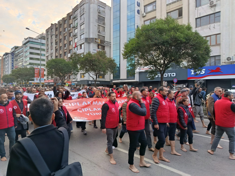 İzmir Büyükşehir Belediyesi’ne bağlı İZENERJİ, İZELMAN, İZFAŞ, EGEŞEHİR ve İZTEK çalışanları, aylardır ödenmeyen yan haklar ve “çıplak ücret” uygulamasına karşı bugün tarihi bir eyleme imza attı. DİSK/Genel-İş 1, 2, 3 ve 9 No’lu Şubelerin çağrısıyla 23 bin işçi, yalın ayak yürüyüş gerçekleştirerek tepkisini ortaya koydu.