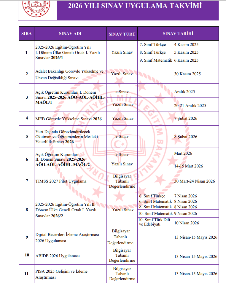 2025-2026 eğitim-öğretim yılı 2. dönem ülke geneli ortak 1. yazılı sınavlar 6. sınıf Türkçe dersi için 7 Nisan’da, 6. ve 8. sınıf Matematik dersi için 8 Nisan’da, 10. sınıflarda ise Matematik dersi için 9 Nisan’da, Türk Dili ve Edebiyatı dersi için 10 Nisan’da uygulanacak. 2. dönem ülke geneli ortak 2. yazılı sınavlar ise 7. sınıf Matematik dersi için 2 Haziran’da, 9. sınıf Türk Dili ve Edebiyatı dersi için 3 Haziran’da düzenlenecek.